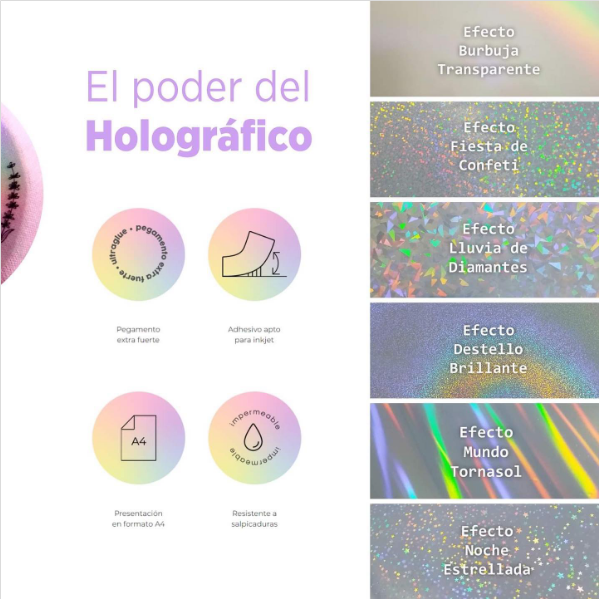 - adhesivo metalizado holográfico con diferentes motivos.