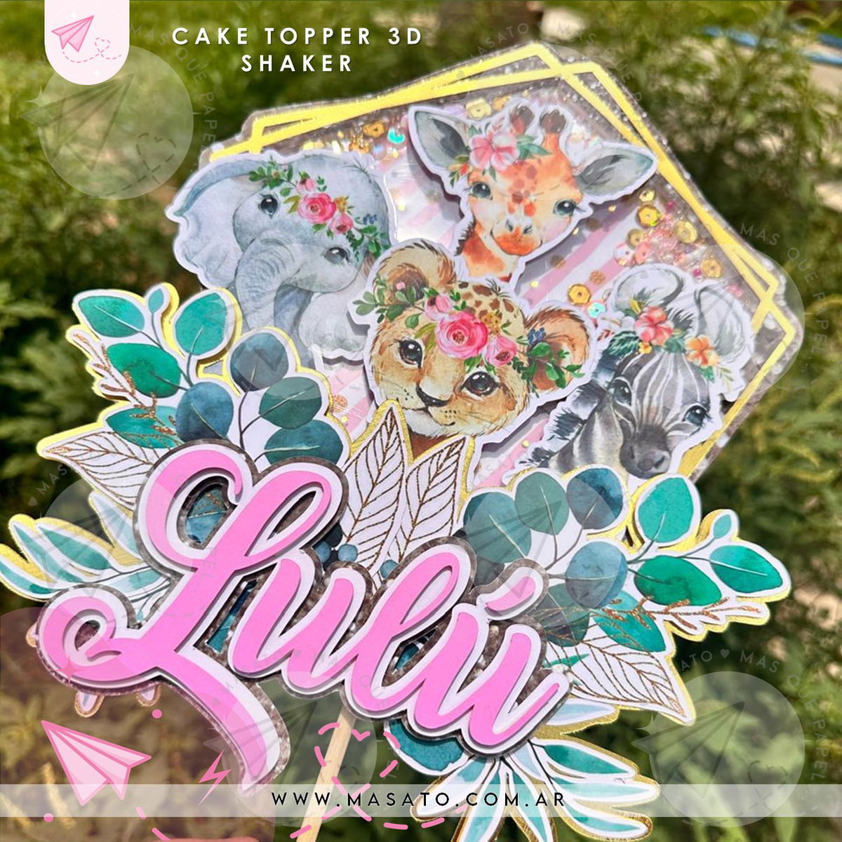 Adorno para la torta cake topper 3D personalizado con el nombre y el personaje, con visor acetato y shaker con movimiento, relleno de canutillos, glitter y lentejuelas. Realizado en diferentes capas con aplique superpuesto para lograr un efecto 3D. Combinando varias técnicas de papeles.