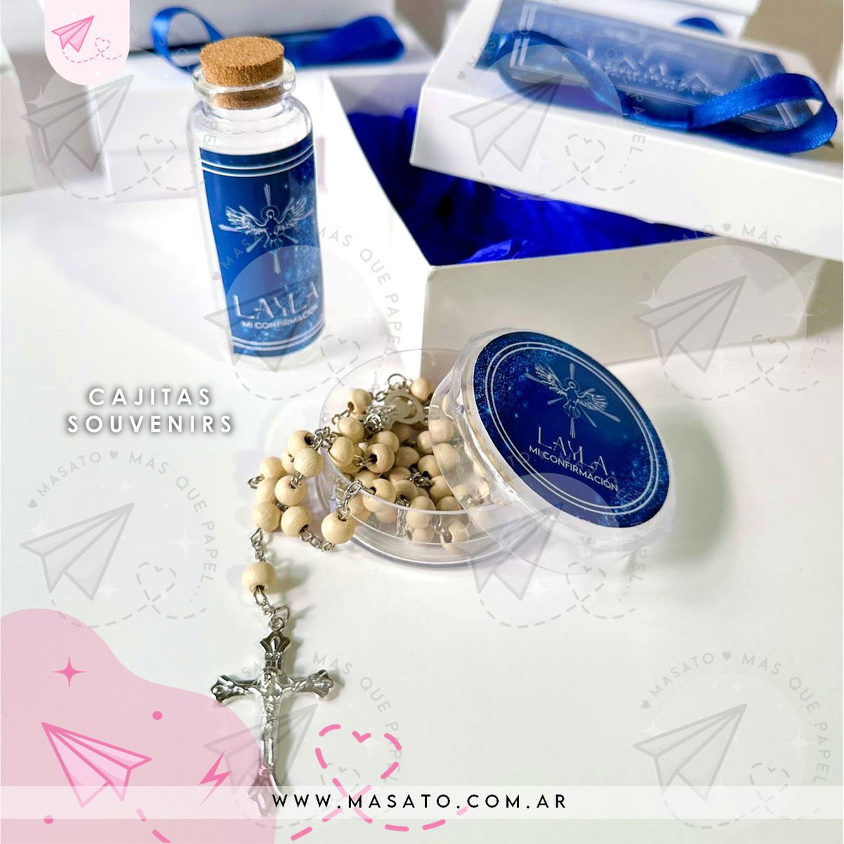 Contiene un Frasquito vacío de Vidrio para Agua Bendita y Una cajita de acrílico con un Rosario dentro. Ideal para Souvenirs de Comunión, Bautismo y Confirmación.