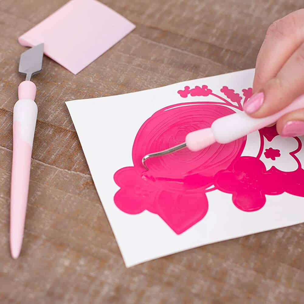 Este juego de herramientas tiene: 1 gancho para deshierbar, 1 raspador para raspar su tapete o aplicar vinilo, 1 espátula para levantar delicadas piezas recortadas del tapete de corte, 1 pick-me up para recoger y colocar artículos pequeños, 1 regla de 15 cm, 1 paño de mico-fibra para limpiar la pantalla LCD de su maquina.